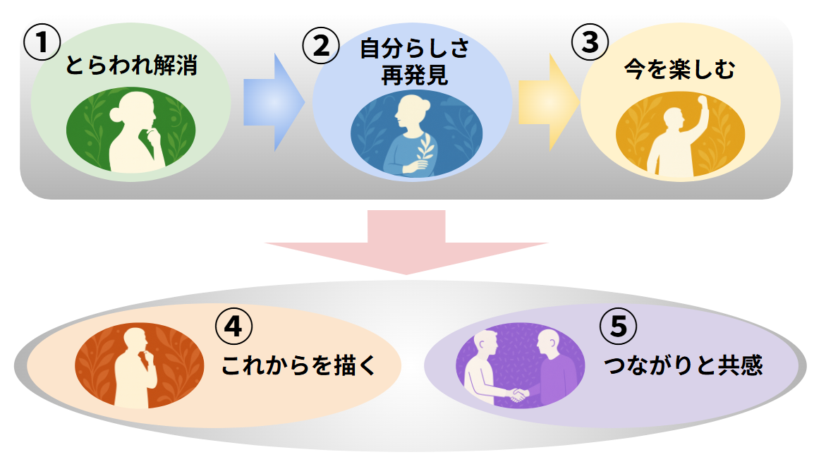 シニア世代が再び人や社会とつながり、心の安らぎや自己肯定感を育むステップです。